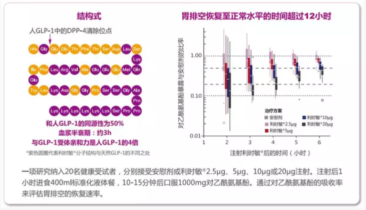 胃排空率是PPG的重要決定因素,是維持血糖穩(wěn)態(tài)的基礎(chǔ)。安慰劑對照研究結(jié)果顯示,利司那肽延緩胃排空恢復(fù)正常水平的時間超過12小時,長期使用效果穩(wěn)定。