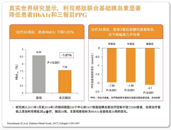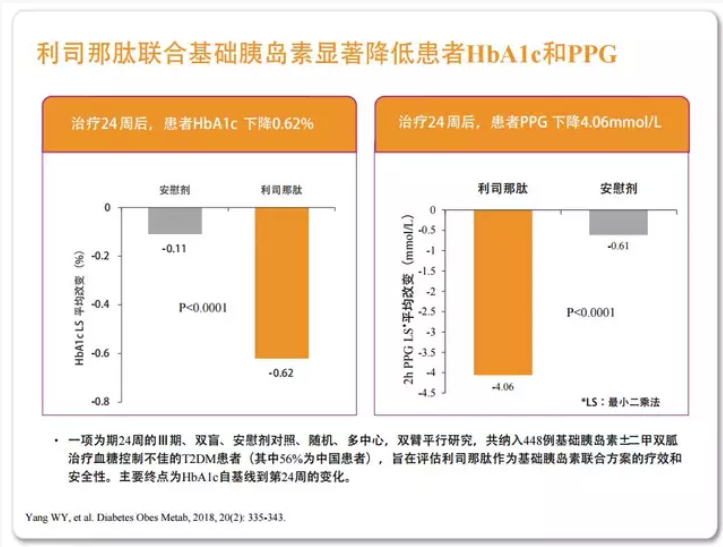 中國的III期臨床研究和真實世界研究均顯示,利司那肽聯(lián)合基礎(chǔ)胰島素能顯著降低HbA1c和PPG。