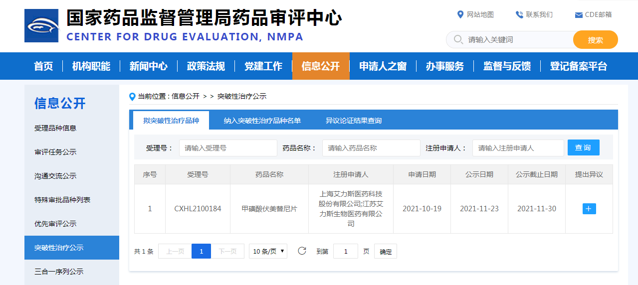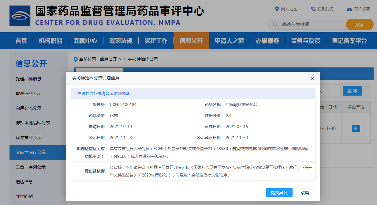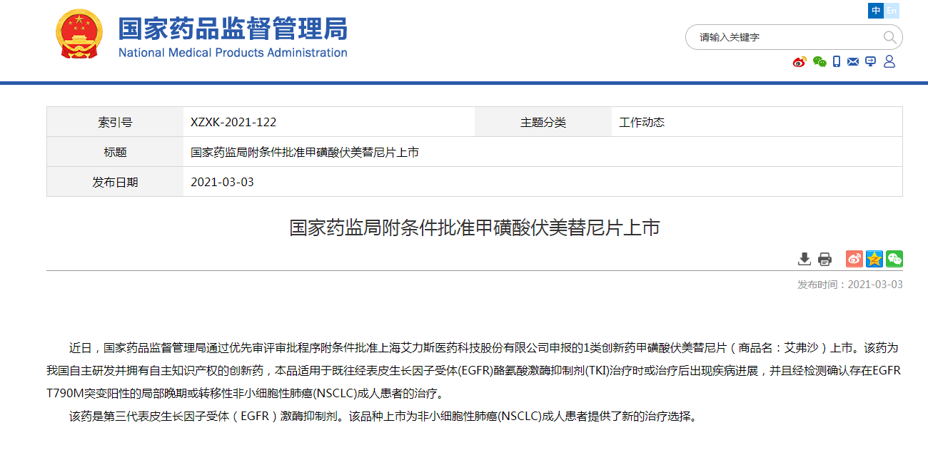 2021年11月23日,中國國家藥監(jiān)局藥品審評(píng)中心(CDE)公示,上海艾力斯醫(yī)藥科技股份有限公司申報(bào)的甲磺酸伏美替尼片被國家藥品監(jiān)督管理局藥品審評(píng)中心(CDE)受理并擬納入突破性療法,一線治療具有表皮生長因子受體(EGFR)外顯子19缺失或外顯子21(L858R)置換突變的局部晚期或轉(zhuǎn)移性非小細(xì)胞肺癌(NSCLC)成人患者。