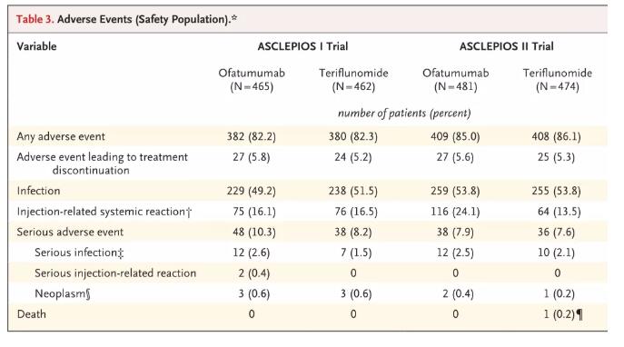 奧法妥木單抗皮下給藥理論上的安全性優(yōu)勢在臨床試驗中也得到充分證明。在ASCLEPIOS I和ASCLEPIOS II 試驗中,奧法妥木單抗組報告的感染、嚴重感染和注射相關感染與特立氟胺組報告的感染、嚴重感染、注射相關感染在數量上并無明顯差異,不增加感染風險[7]。ALITHIOS研究長達3.5年的開放標簽擴展試驗也證明了奧法妥木單抗的安全性,數據顯示奧法妥木單抗能長期維持 IgG 水平,感染總體發(fā)生率低。