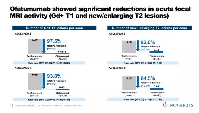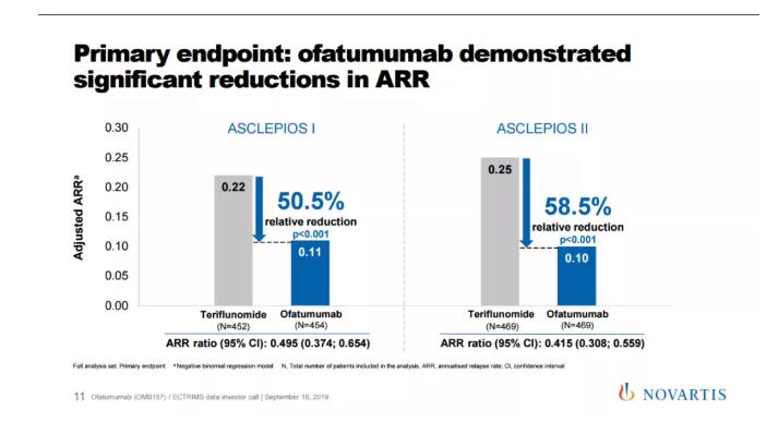 兩項代號為ASCLEPIOS I和ASCLEPIOSII的III期試驗數據和一項代號為ALITHIOS的長達3.5年的開放標簽擴展研究證明了奧法妥木單抗皮下給藥的療效和安全性。 ASCLEPIOS I和ASCLEPIOSII研究中,與每日1次口服特立氟胺14mg相比,每月1次皮下給藥奧法妥木單抗可使患者的年復發(fā)率(ARR)降低近60%(ARR=0.1相當于患者每10年復發(fā)1次)[6]。