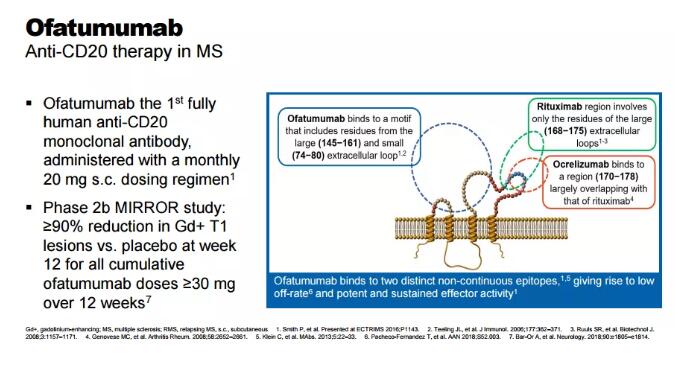 奧法妥木單抗是首個靶向CD20的全人源單克隆抗體,能夠選擇性與B細胞表面CD20抗原結合,通過抗體依賴的細胞介導的細胞毒作用(ADCC)和補體依賴的細胞毒性作用(CDC)誘導致病性B細胞溶解消除。相比其他抗CD20抗體,奧法妥木單抗作為全人源單抗,減少了免疫原性,不會被人體抗體迅速清除,具有更高的生物利用度[2-3],同時可以特異性結合CD20的胞外大環(huán)和小環(huán)兩個位點,因此較小劑量就可達到等效治療濃度,具備了開發(fā)成皮下給藥制劑的優(yōu)勢。