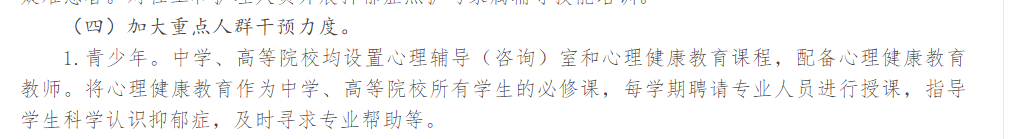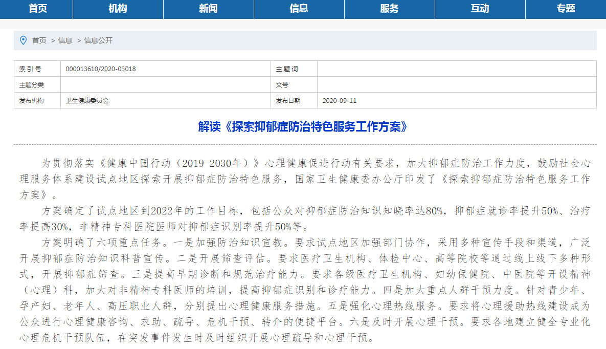 2020年9月11日,國(guó)家衛(wèi)健委官網(wǎng)發(fā)布《探索抑郁癥防治特色服務(wù)工作方案》,方案中講到,各高中及其高等院校都應(yīng)把抑郁癥篩查納入學(xué)生健康體檢內(nèi)容。