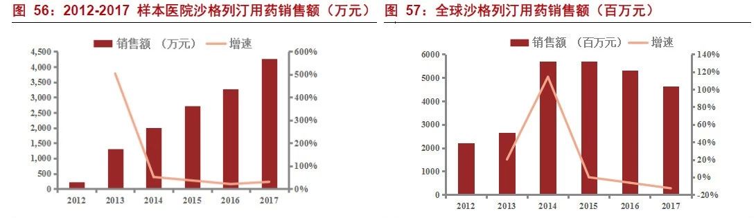 從2012-2017年樣本醫(yī)院數(shù)據(jù)來(lái)看,沙格列汀在中國(guó)的銷(xiāo)售額逐年增加,2017年樣本醫(yī)院銷(xiāo)售額超過(guò)4000萬(wàn),全球銷(xiāo)售額達(dá)到45億。