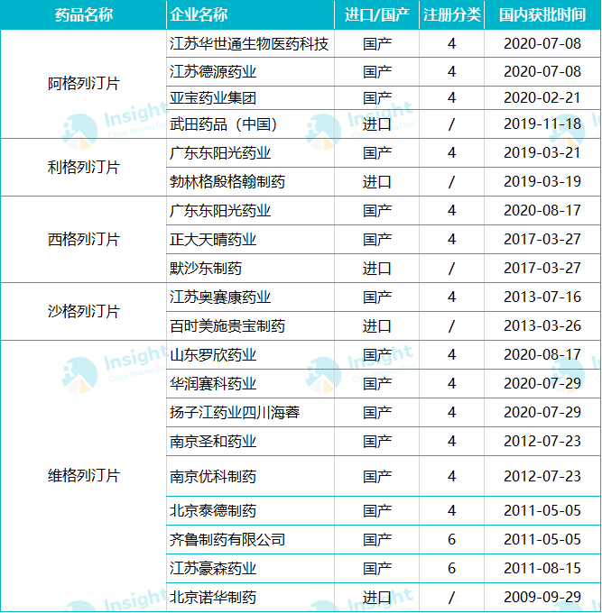 目前,包括沙格列汀在內(nèi)已有5個(gè)品種(單方)的DPP-4抑制劑在國(guó)內(nèi)上市,其余4個(gè)品種分別為西格列汀、維格列汀、阿格列汀、利格列汀,均被納入醫(yī)保乙類(lèi)目錄,且有國(guó)內(nèi)仿制藥上市(詳情如下)。值得注意的是,維格列汀是其中仿制藥上市企業(yè)數(shù)最多的品種,除原研外國(guó)內(nèi)已有8家仿制藥獲批上市,在第三批國(guó)家集采中以最高89%(非差比)的降幅中標(biāo)。