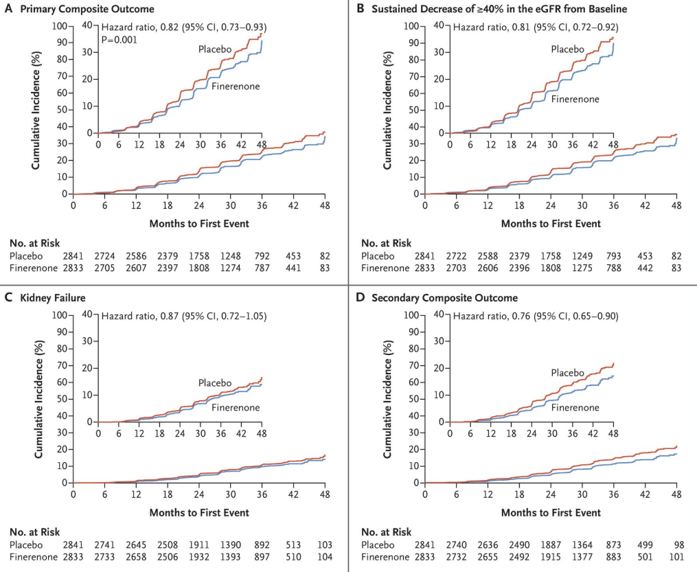 FIDELIO-DKD(Finerenone降低糖尿病腎病腎衰竭和疾病進展)是一項隨機、雙盲、安慰劑對照、平行組、多中心、事件驅(qū)動的III期研究,入組了來自全球48個國家1000多個地點的約5700例伴有CKD的T2D患者。研究中,這些患者被隨機分配,接受每天一次口服10mg或20mg的Finerenone或安慰劑,同時接受標準護理,包括降糖治療和最大耐受劑量的腎素-血管緊張素系統(tǒng)(RAS)阻斷劑,如血管緊張素轉(zhuǎn)換酶(ACE)抑制劑或血管緊張素II受體阻滯劑(ARB)。該研究已經(jīng)達到了主要終點。
