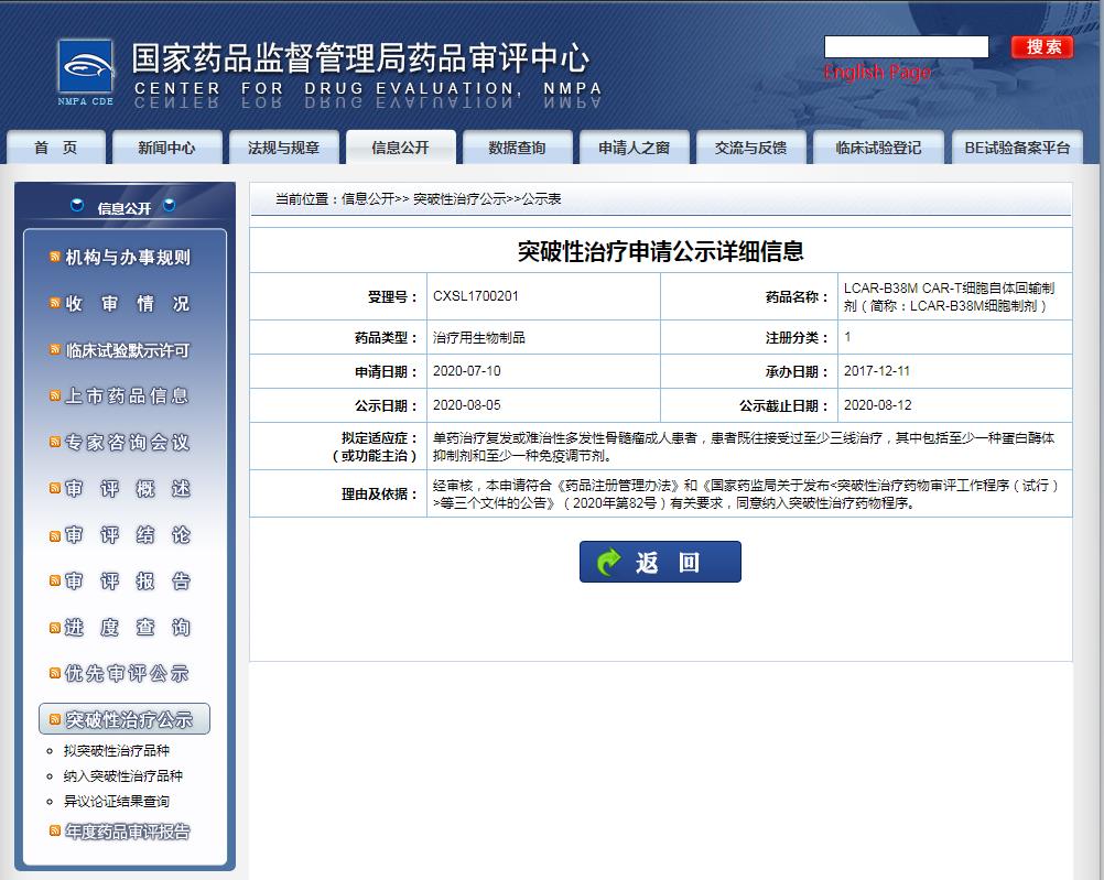 這是第 3 個擬納入突破性療法的 CAR-T 產(chǎn)品,與此前納入突破性療法的傳奇生物 LCAR-B38M 同樣靶向 BCMA。