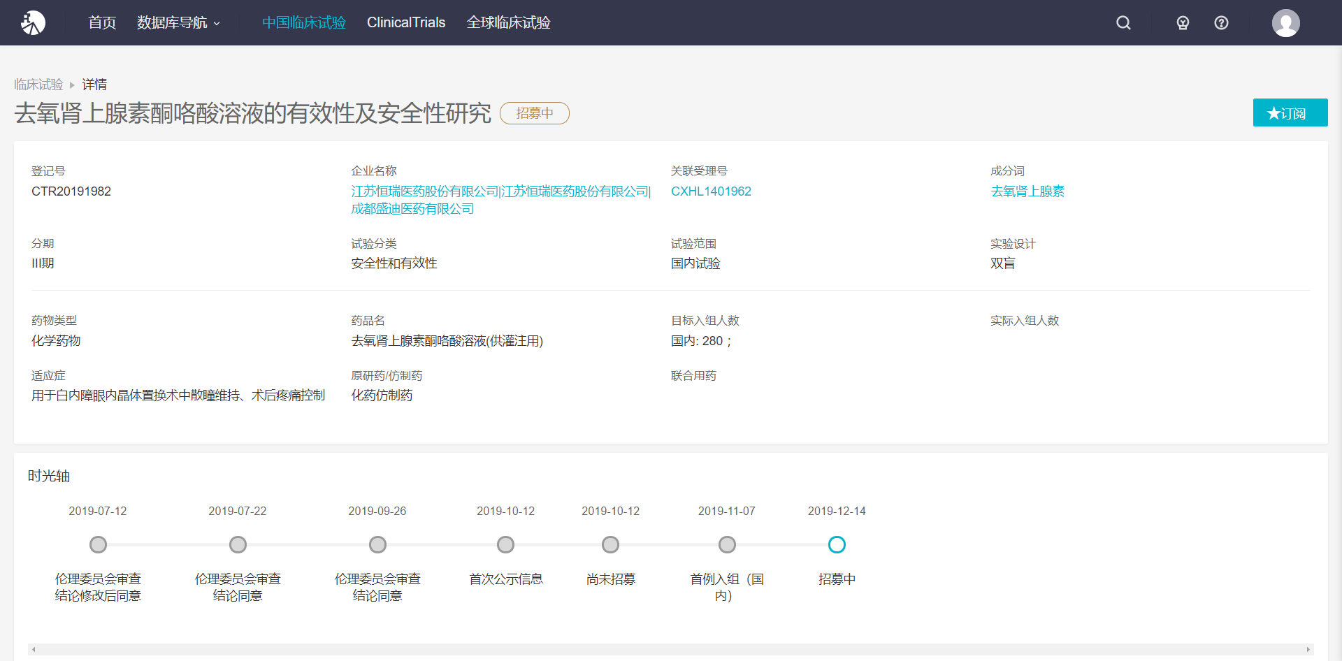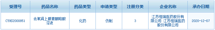 12月7日,CDE官網(wǎng)顯示,恒瑞提交了3類仿制藥「去氧腎上腺素酮咯酸溶液」上市申請,用于白內障手術或人工晶狀體置換手術過程中維持瞳孔大小,防止手術中瞳孔縮小并且緩解術后眼部疼痛。