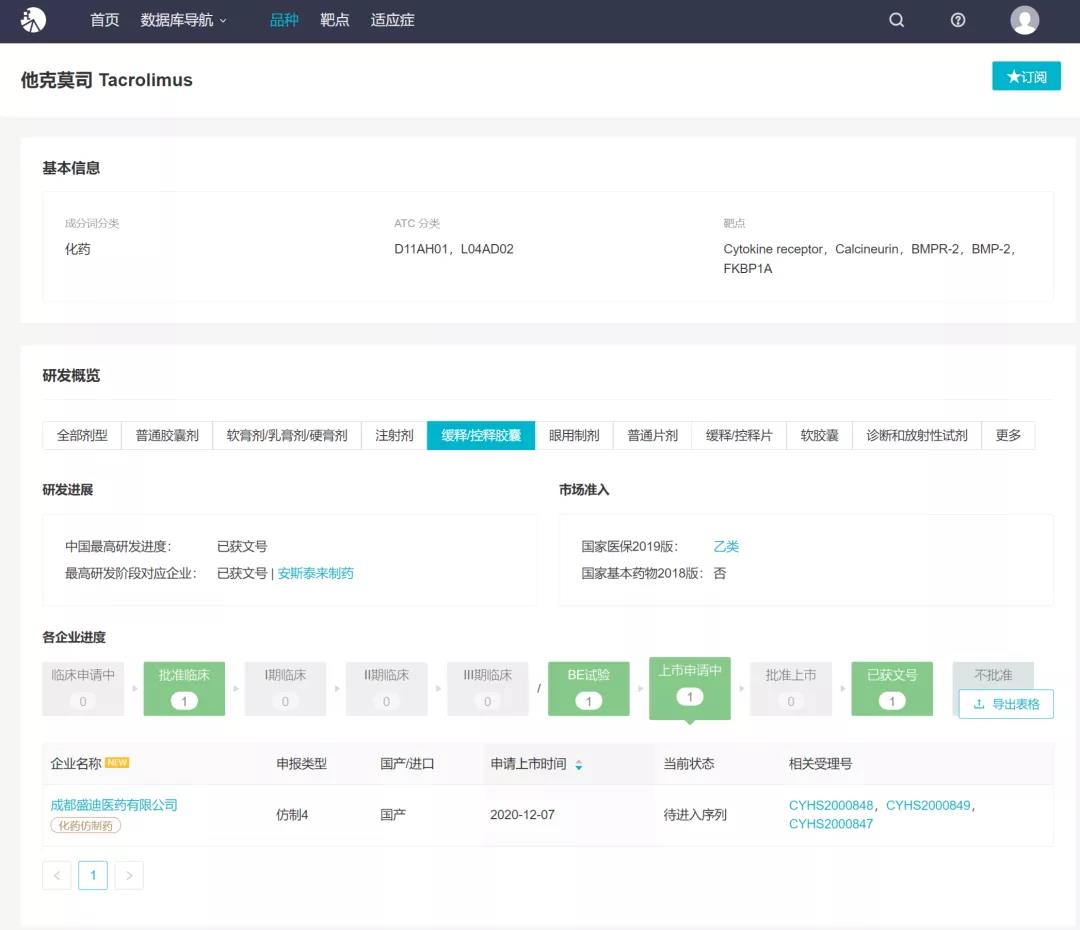 公開數(shù)據(jù)顯示,他克莫司屬于重磅藥品,全球銷售額峰值達(dá)到22億美元。目前,其在國內(nèi)已有膠囊、軟膏、注射劑、眼用制劑和緩釋膠囊獲批上市,?中,膠囊與緩釋膠囊均已進(jìn)入醫(yī)保乙類目錄,不過此前緩釋膠囊僅安斯泰來的原研產(chǎn)品已批上市,而無國內(nèi)仿制藥報上市。