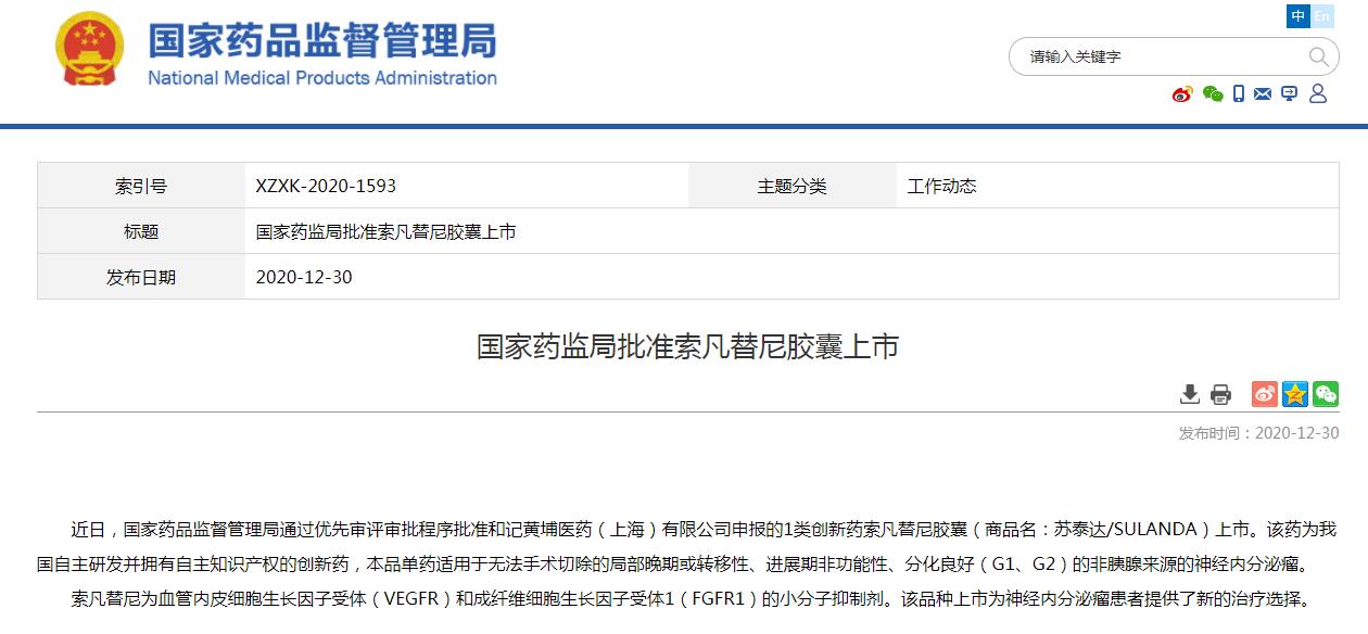2020年12月30日,國家藥品監(jiān)督管理局(NMPA)官網(wǎng)顯示,和記黃埔醫(yī)藥(上海)有限公司申報的1類創(chuàng)新藥索凡替尼膠囊(商品名:蘇泰達/SULANDA)上市申請正式獲NMPA批準。