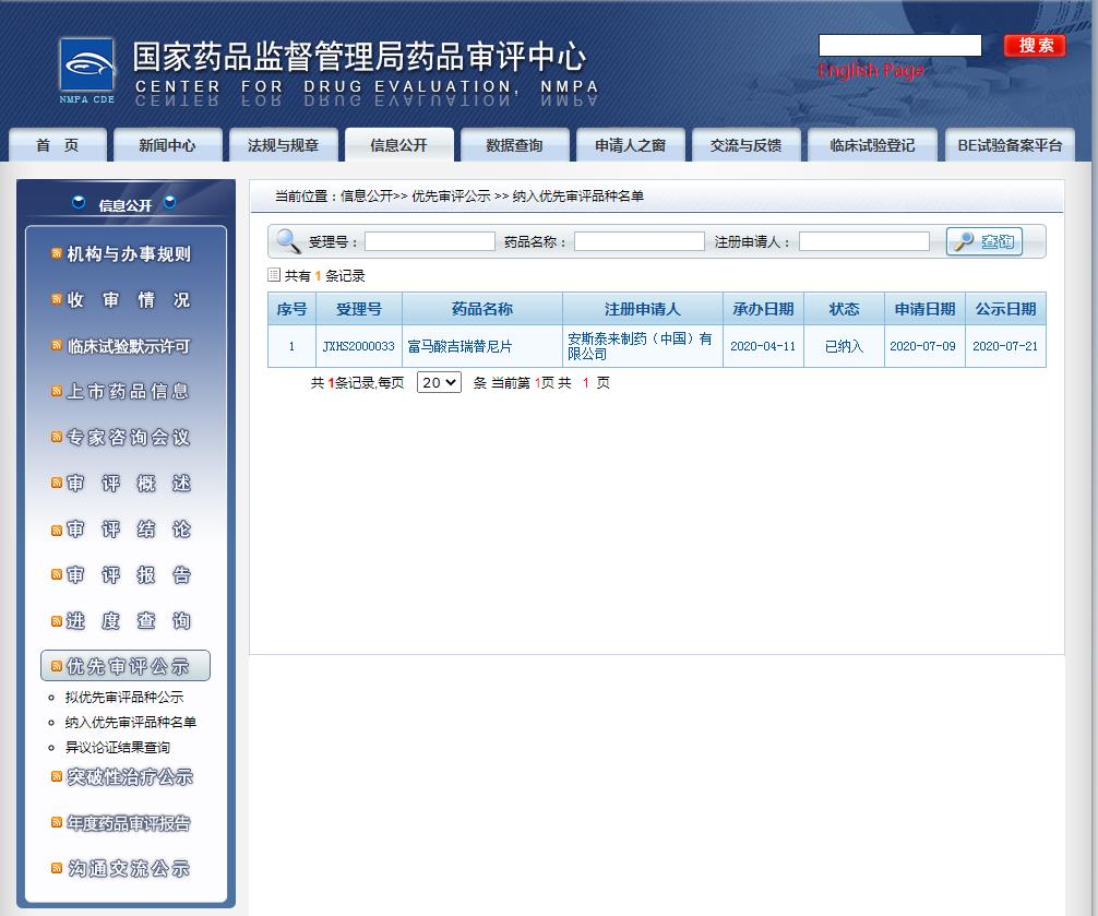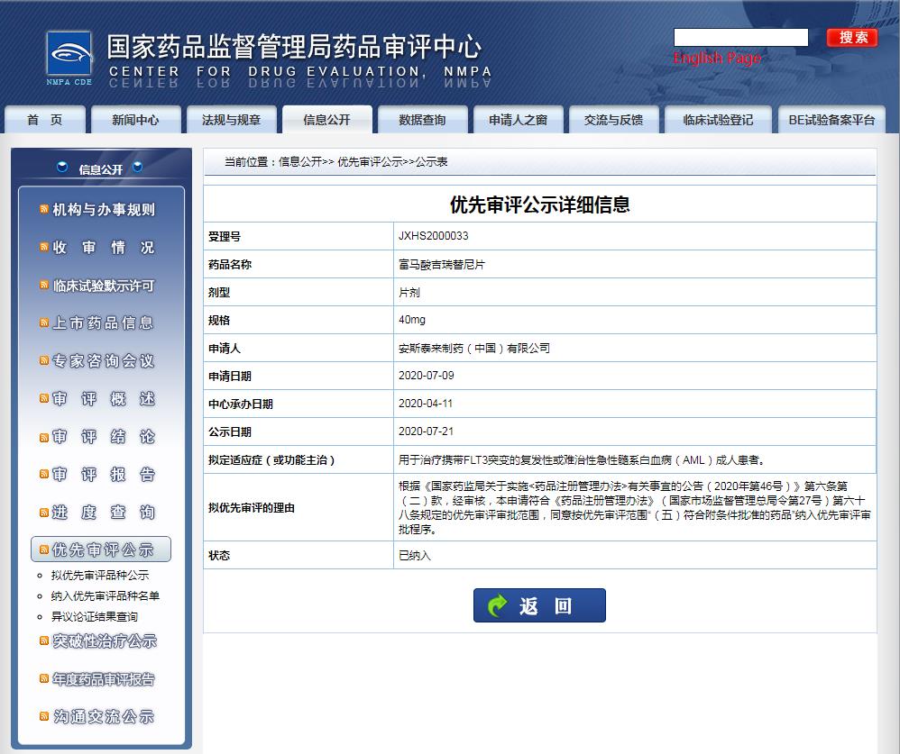 2020年4月10日,安斯泰來(lái)在中國(guó)提交的吉瑞替尼上市申請(qǐng)獲得國(guó)家藥品監(jiān)督管理局藥品審評(píng)中心(CDE)受理,并且在4月17日被擬納入優(yōu)先審評(píng),在7月30日正式納入優(yōu)先審評(píng)。距離即將獲批有不到10個(gè)月的時(shí)間。