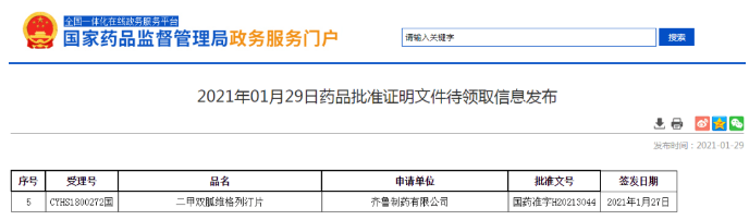 今天(1月29日),NMPA官網(wǎng)顯示,齊魯制藥以仿制4類報(bào)產(chǎn)的二甲雙胍維格列汀片獲批并視同過評(píng),成為國(guó)內(nèi)首仿。二甲雙胍維格列汀片為復(fù)方降糖藥,