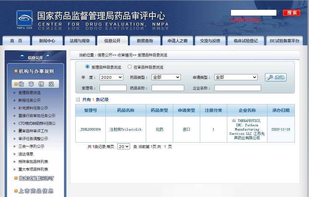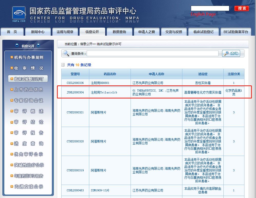 2021年1月,查看國(guó)家藥監(jiān)局藥品審評(píng)中心(CDE)網(wǎng)站公示可知,先聲藥業(yè)和G1公司聯(lián)合申報(bào)的Trilaciclib用于高骨髓毒性化療方案的實(shí)體瘤相關(guān)臨床試驗(yàn)申請(qǐng)已獲得批準(zhǔn)。
