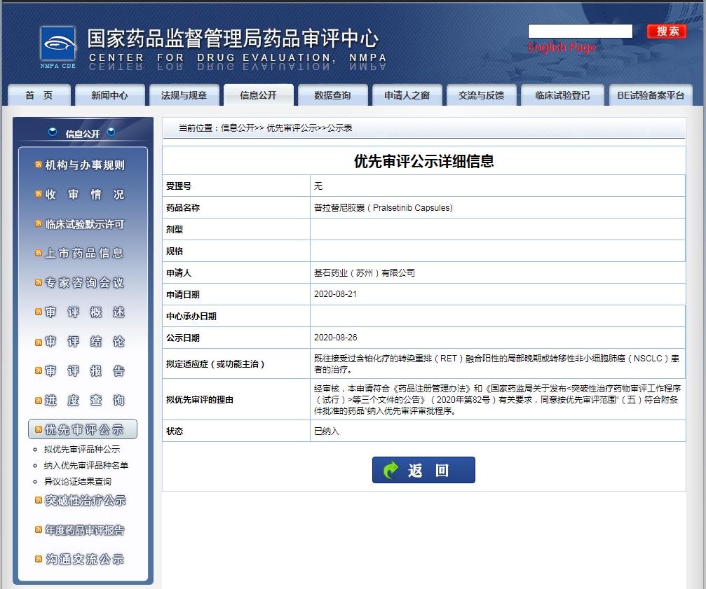 3月23日,中國(guó)國(guó)家藥監(jiān)局(NMPA)官網(wǎng)信息顯示,基石藥業(yè)申報(bào)的RET抑制劑普拉替尼(pralsetinib,BLU-667)新藥上市申請(qǐng)(NDA)已獲批上市,目前藥品批準(zhǔn)證明文件為“待領(lǐng)取”狀態(tài),批準(zhǔn)文號(hào)為:國(guó)藥準(zhǔn)字HJ20210018。