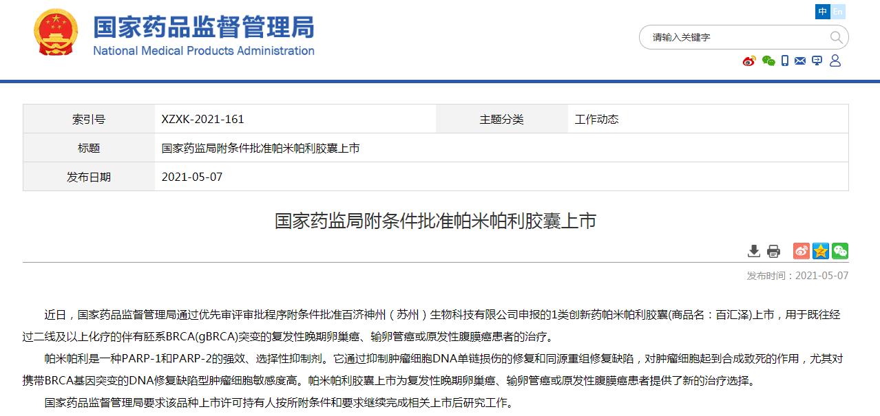 2021年05月07日,查詢國家藥品監(jiān)督管理局(NMPA)官網(wǎng)可知,百濟神州(蘇州)生物科技有限公司提交的PARP1/2抑制劑帕米帕利膠囊(受理號:CXHS2000021)NMPA已附條件批準上市,這是國內(nèi)獲批上市的第4款PARP抑制劑。