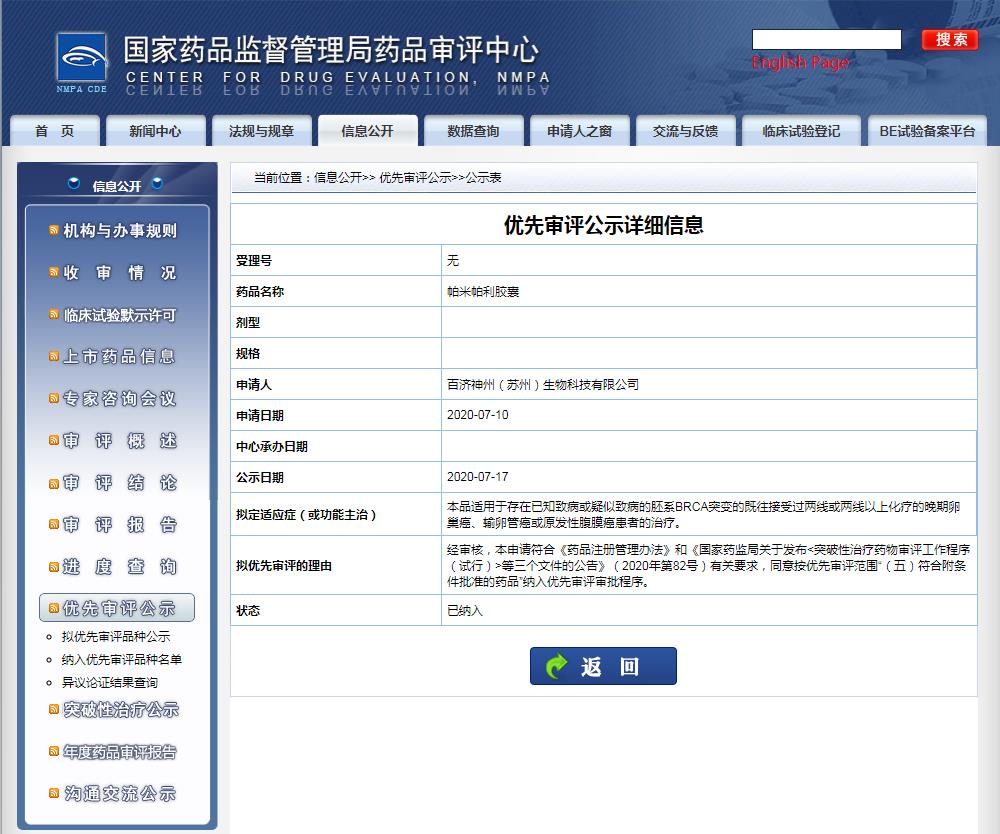 帕米帕利是百濟神州研發(fā)的1類新型口服PARP抑制劑,對攜帶BRCA基因突變的DNA修復缺陷型腫瘤細胞敏感度高。2020年7月,百濟神州向NMPA遞交了上市申請,并被CDE納入優(yōu)先審評。