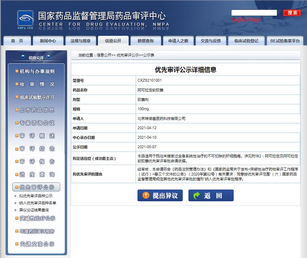 阿可拉定最早于2008年11月在我國申報臨床,并于2015年11月申報生產(chǎn)(CXZS1500023)進入了CDE,該藥是重大專項品種,按特殊審批品種審評。2016年阿可拉定軟膠囊的上市申請被列入了第2批181個臨床自查藥品清單,同年的8月12日審批完畢,審批結(jié)論為“不批準(zhǔn)”。
