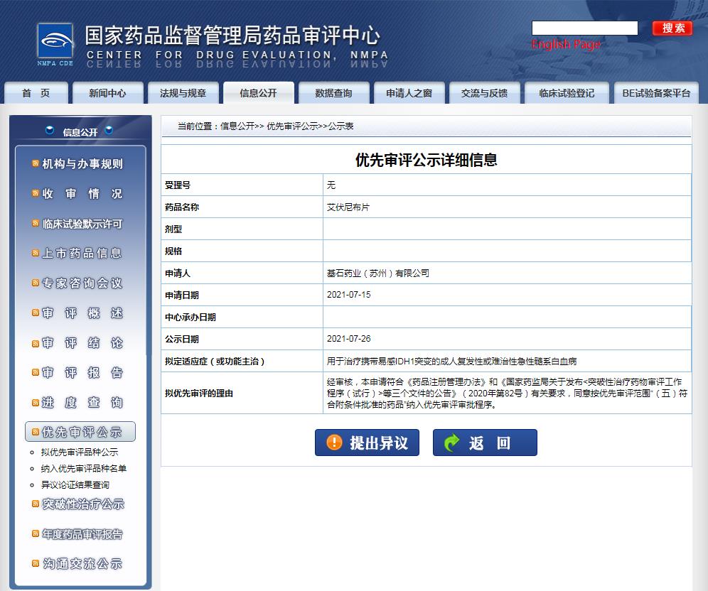 2021年7月26日,基石藥業(yè)(蘇州)有限公司提交的艾伏尼布片(ivosidenib)被國家藥品監(jiān)督管理局藥品審評中心(CDE)擬納入優(yōu)先審評,用于治療攜帶易感IDH1突變的成人復發(fā)性或難治性急性髓系白血病(R/R AML)。這是一款靶向異檸檬酸脫氫酶1(IDH1)突變的治療藥物。