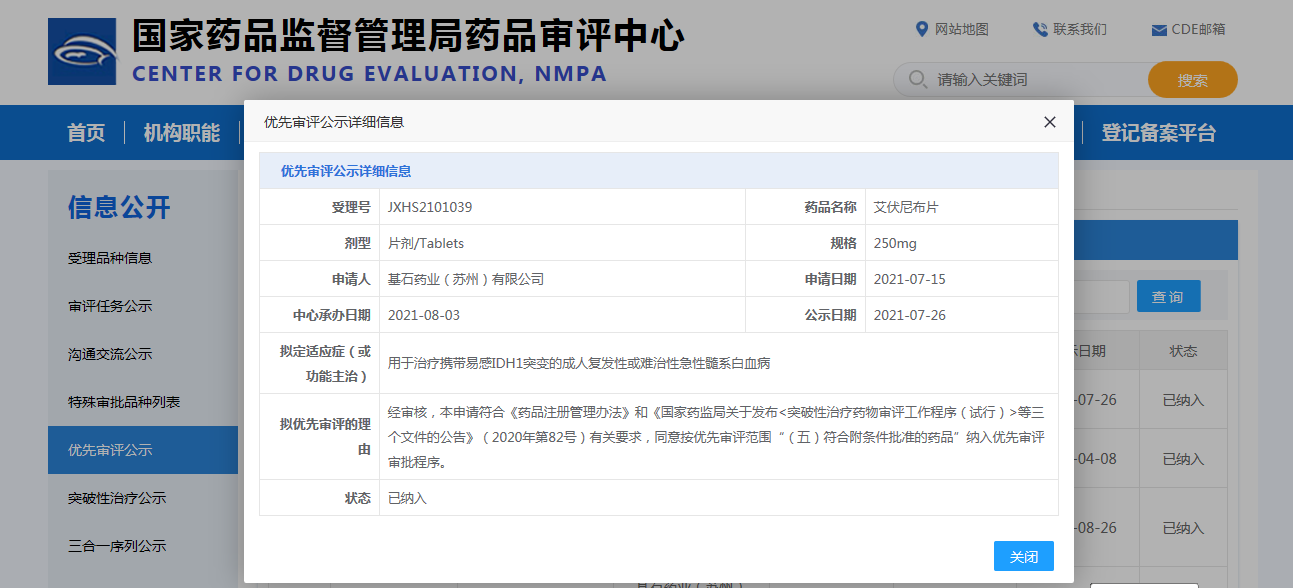 艾伏尼布作為一款口服IDH1抑制劑,于2018年7月獲美國FDA批準,用于治療IDH1突變復發(fā)/難治急性髓系白血病成人患者。之后,入選了2020版《CSCO惡性血液病診療指南》,又于2020年被中國國家藥品審評中心(CDE)納入優(yōu)先審評審批程序。